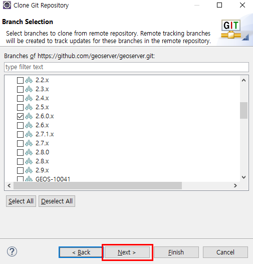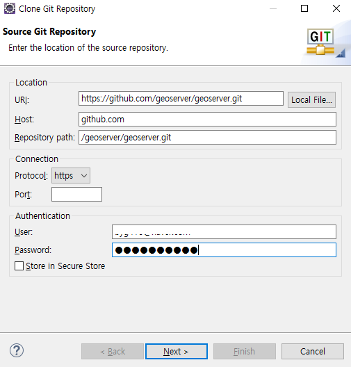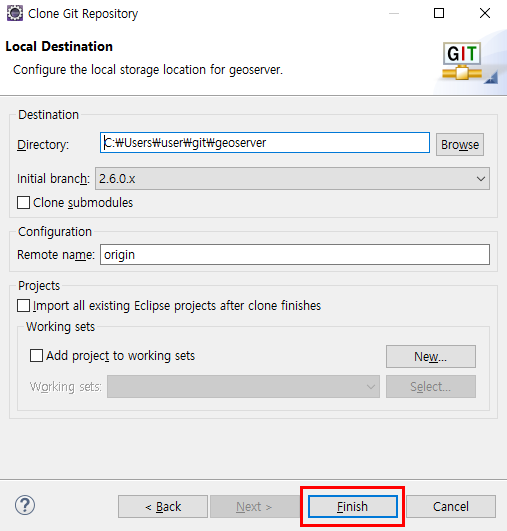 Finish를 선택하면 Git으로부터 소스를 내려받아서 local 저장소에 저장하게 된다.