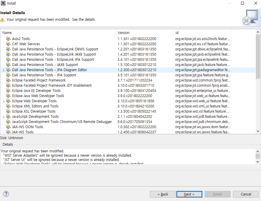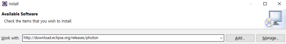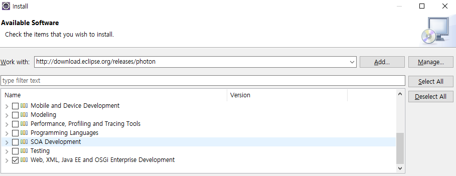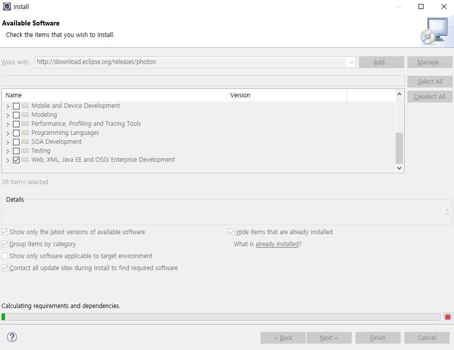 http://download.eclipse.org/releases/photon 을 입력한 후 플러그인중에서 [Web, XML, Java EE] 선택하여 설치를 진행한다.