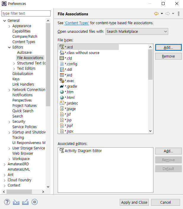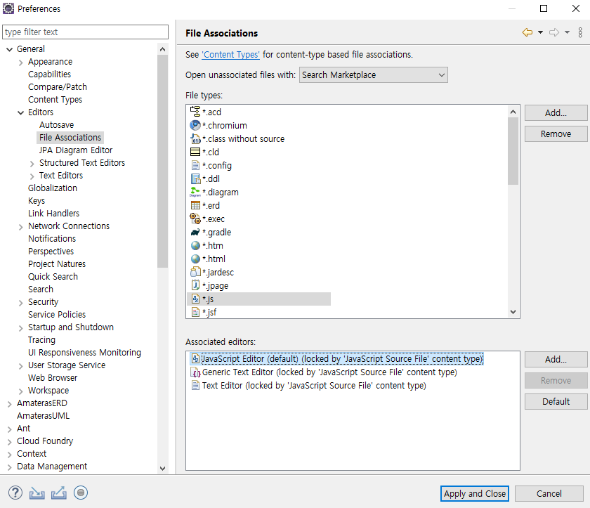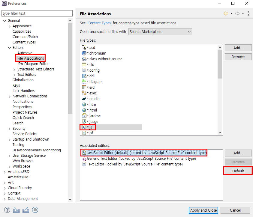 *js 를 선택하고 하단의 Associated editors에서 Generic Text Editor을 선택한 후 Apply and Close를 선택한다.