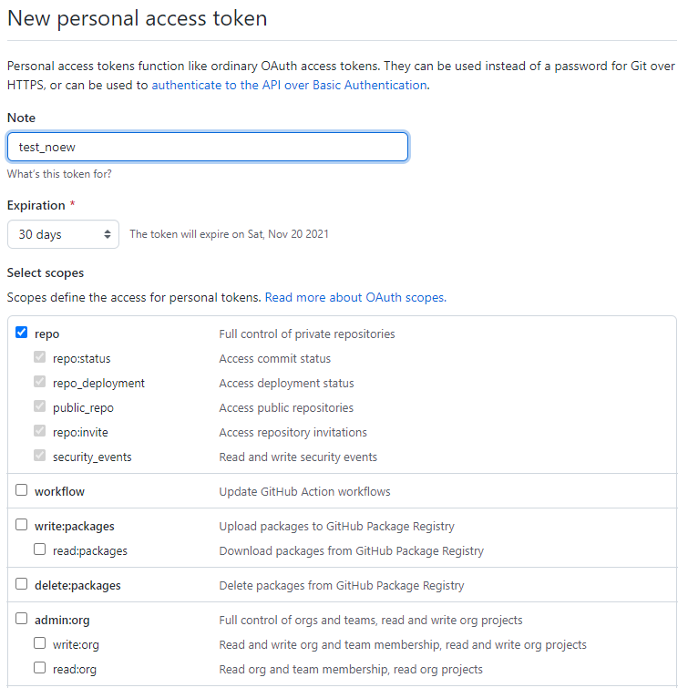 그런 후, 이름을 입력하고 하단의 scope 권한 범위를 설정한 후 Generate token를 선택하면 tokens이 발급된다.