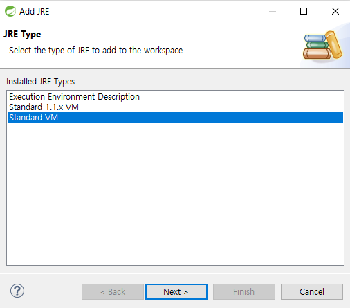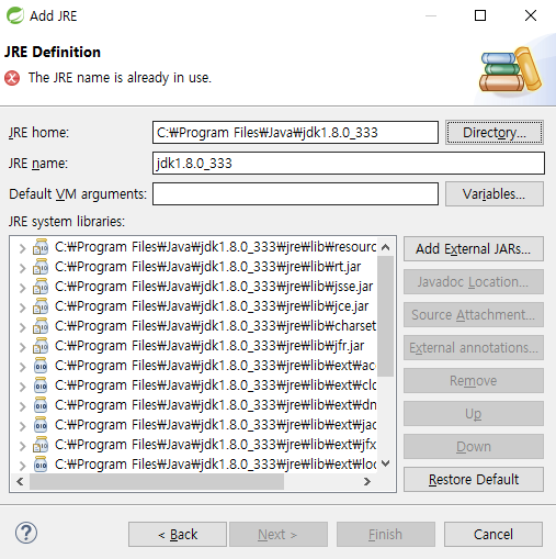 필자는 이미 포함된 JDK이기때문에 오류가 나지만, 만약 설정되어 있지 않는 사람이라면 정상적으로 Finish 할 수 있다.