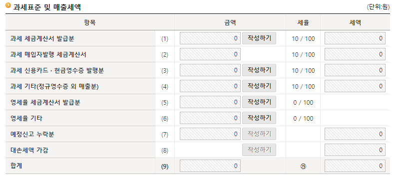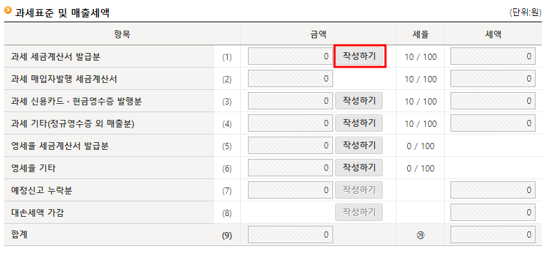 다음으로 넘어가면 이제 본격적으로 신고를 진행하게 됩니다. 우선 과세표준 및 매출세액에 대해서 신고를 해야합니다.