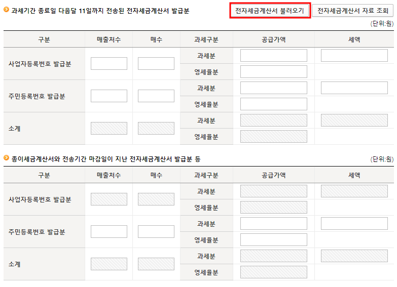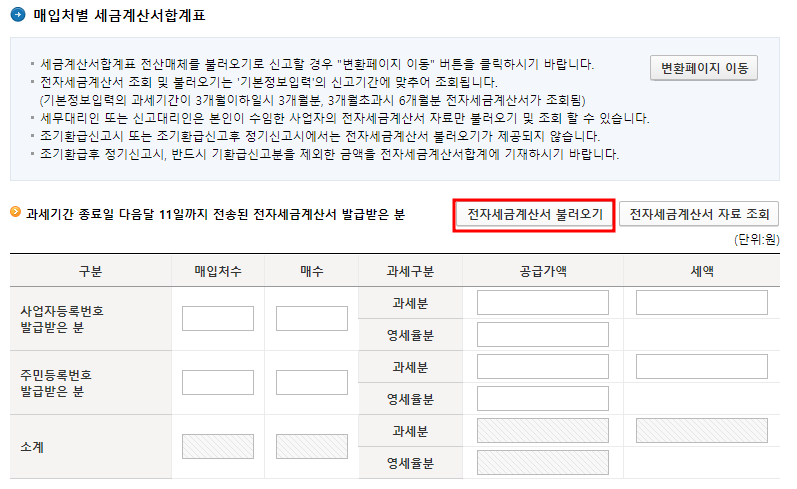 전자세금계산서 불러오기를 선택합니다. 세금계산서를 발급한 내역이 있다면 조회가 될것이고 없다면 아무것도 조회되지 않습니다. 완료되었다면 저장 후 다음으로 이동합니다.