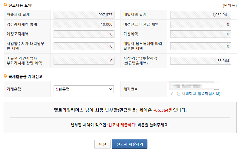 최종 신고서 제출전 화면입니다. -65,000원정도 돌려받게 되었네요. 외식비 벌었습니다. 마지막으로 신고서 제출하기를 선택합니다.