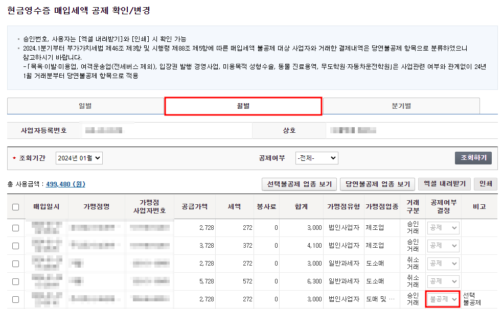 부가세 신고를 본격적으로 진행하기전에 현금영수증 세액공제 확인/변경을 진행하여야합니다. 위탁판매자는 업체에서 물건을 매입하게되는데, 실제로 개인사업의 판매를 위하여 매입한 내역이라면 공제여부결정을 불공제에서 공제로 변경해주어야합니다. 변경해주지 않고 불공제로 남겨둔다면 그만큼 공제가 되지 않는것이기 때문에 손해를 볼 수 있습니다. 사업에 관련된 것이라면 공제로 변경해주어야 합니다.