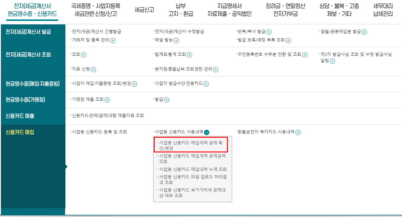 홈택스 → 신용카드 매입 → 사업용 신용카드 매입세액 공제 확인/변경메뉴를 선택합니다.