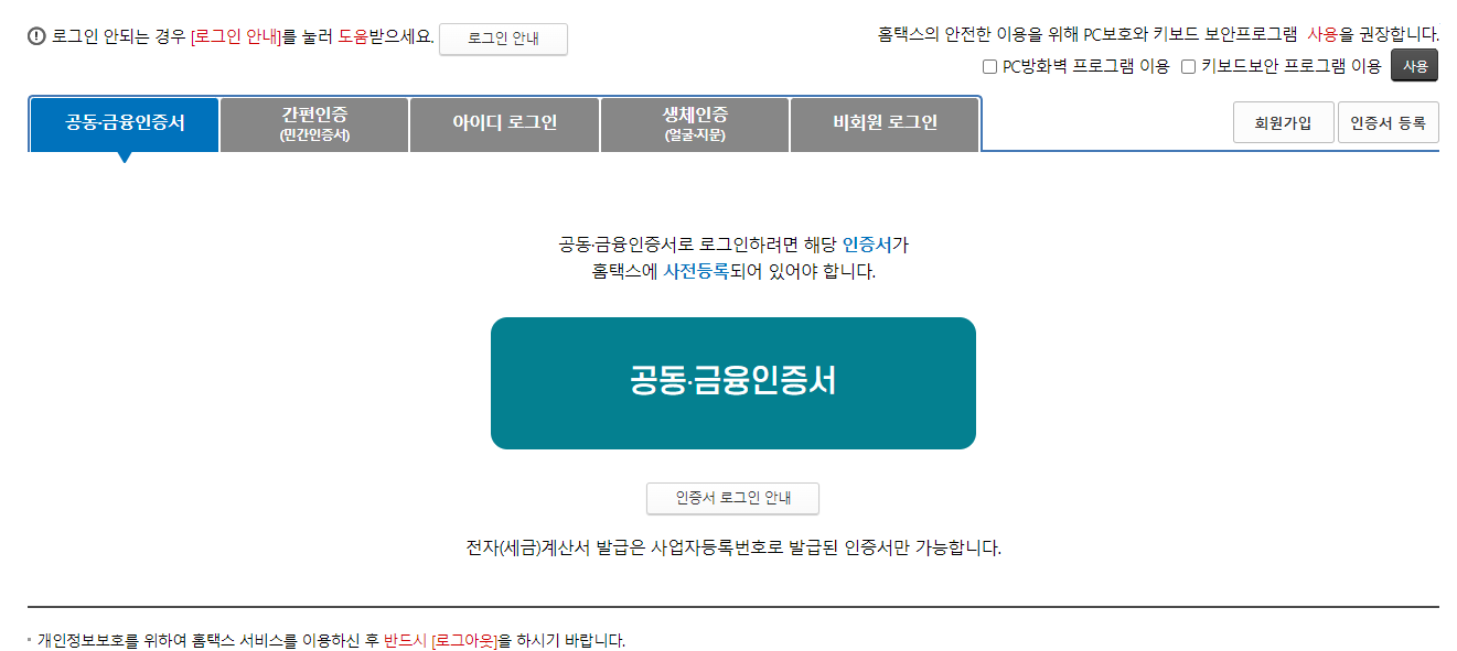 홈페이지를 들어가게되면 로그인을 진행해야 합니다. 로그인 방식에는 공동인증서, 간편인증, 아이디 로그인등이 있는데 그 중에 편한방법으로 로그인을 진행하면 됩니다.