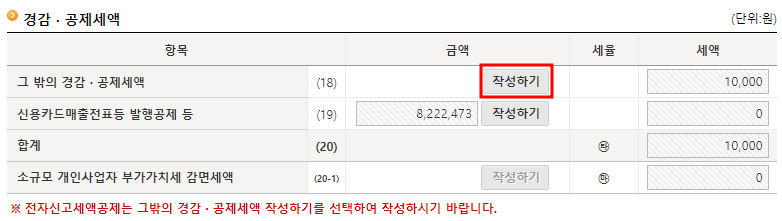 해당 네모박스부분에 작성하기 버튼이 표시됩니다. 해당 버튼을 선택하면 10,000원을 할인해줍니다. 세액에 10,000이 입력되었다면 입력완료 후 빠져나옵니다.