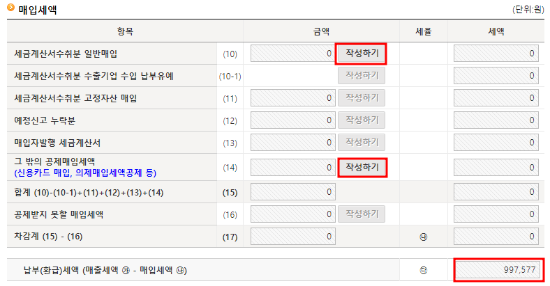 매입세액의 경우 우리가 해야할것은 세금계산서수취분 일반매입과 그 밖의 공제매입세액 2가지를 작성해야합니다. 해당 매입을 잡지 않으면 아래의 997,577만원을 세금으로 내야한다고 표시되고 있습니다. 신고 잘 해야겠지요?
