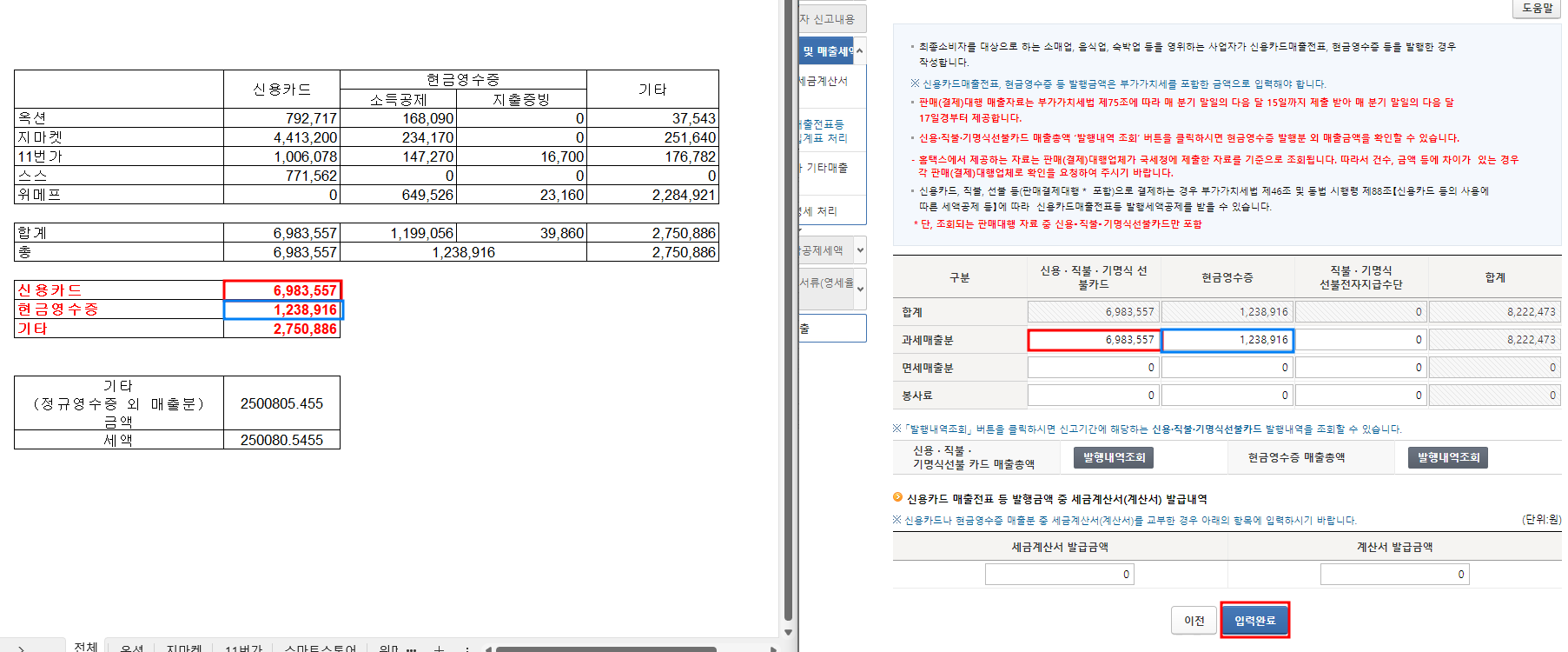 기타값과 계산해둔 세액을 각각 입력합니다. 여기까지 한 후 입력완료를 선택합니다.