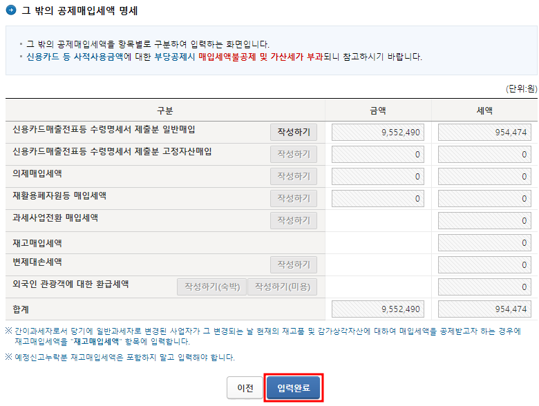 과세표준명세도 완료되었습니다. 이제 매입세액을 입력하도록 하겠습니다.