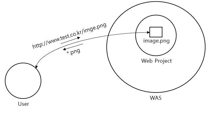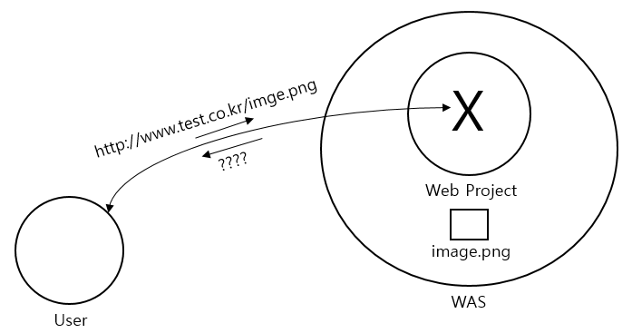 이미지 파일 혹은 일반 파일들이 WAS의 웹프로젝트 외부에 저장되어 있는 경우 단순 리소스 조회로 파일을 가져올 수 없는 경우가 있다. 따라서 WAS를 통해서 WAS의 웹프로젝트 외부에 저장되어 있는 파일을 조회하도록 처리한다.
