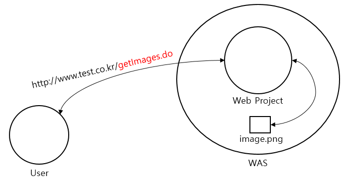 이미지 파일 혹은 일반 파일들이 WAS의 웹프로젝트 외부에 저장되어 있는 경우 단순 리소스 조회로 파일을 가져올 수 없는 경우가 있다. 따라서 WAS를 통해서 WAS의 웹프로젝트 외부에 저장되어 있는 파일을 조회하도록 처리한다.