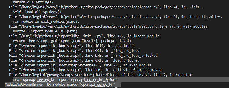 VisualCode에서도 F5로 실행시 openapi_gg_go_kr파일을 잘 찾고, CommandLine에서 scrapy crawl 명령어로 실행해도 openapi_gg_go_kr파일을 잘 찾는다.