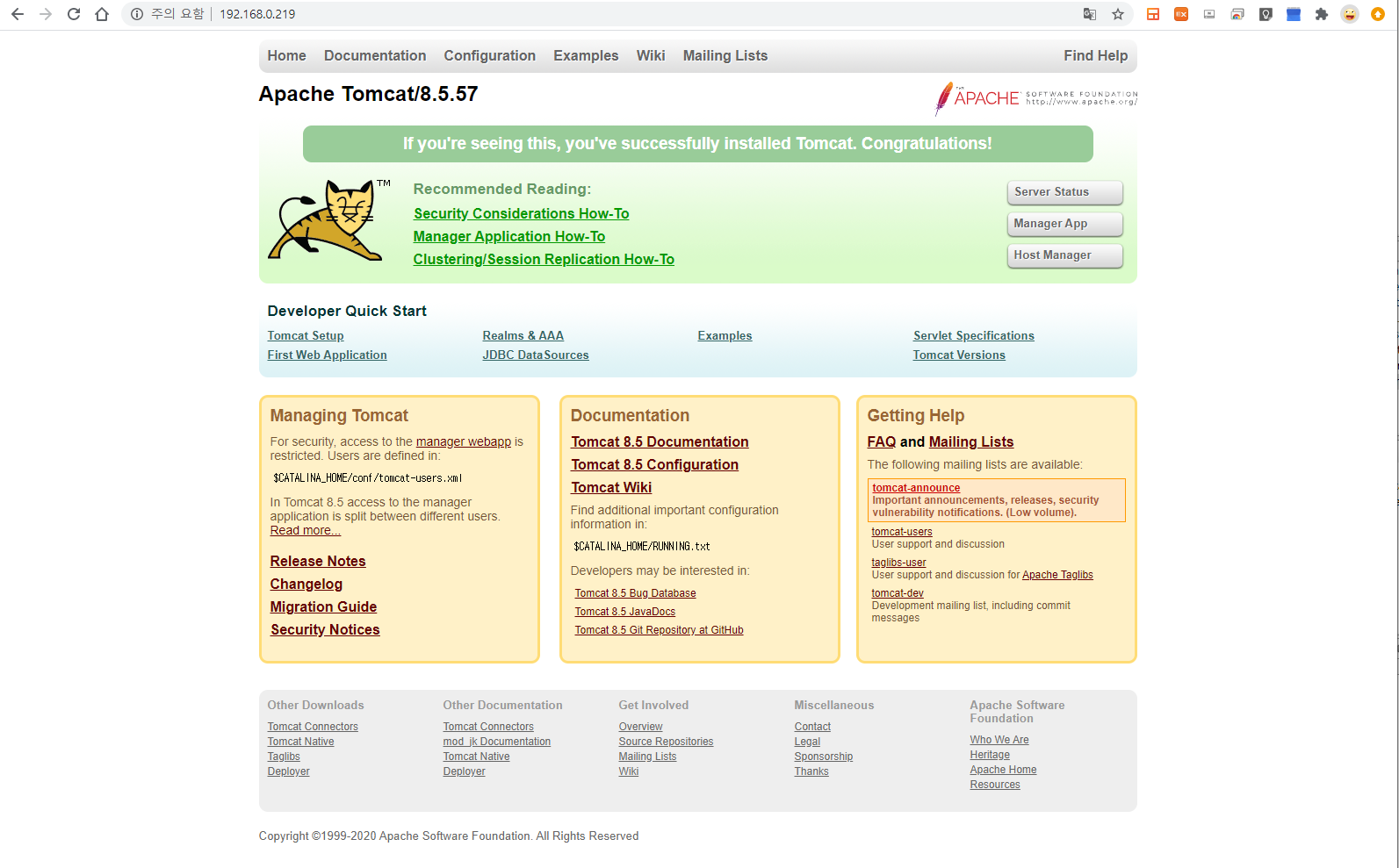 80 포트로 접속하면 tomcat페이지가 잘 뜨는것을 확인할 수 있다.